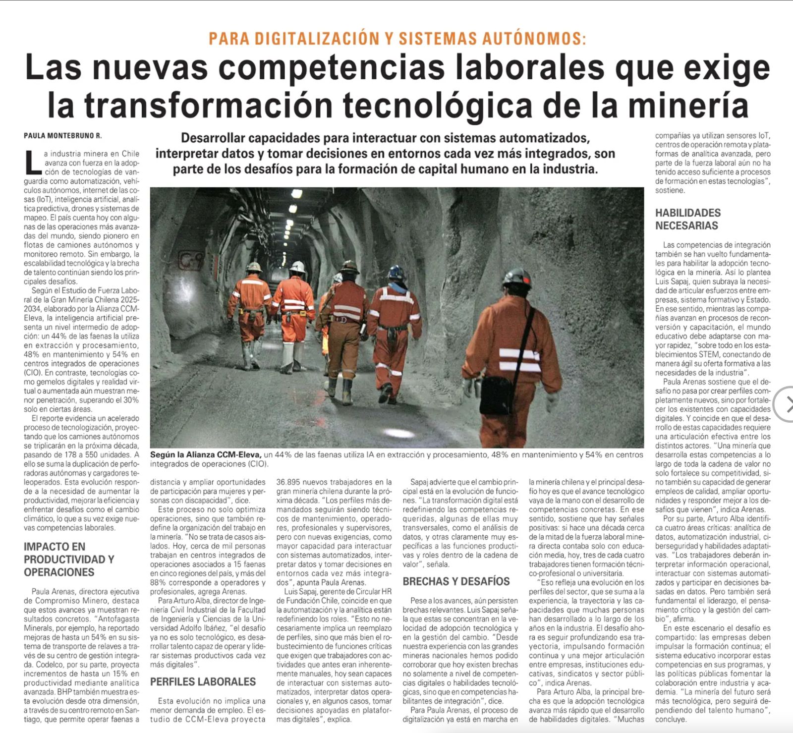 Paula Arenas sostiene que el desafío no pasa por crear perfiles completamente nuevos, sino por fortalecer los existentes con capacidades digitales. Y coincide en que el desarrollo de estas capacidades requiere una articulación efectiva entre los distintos actores. “Una minería que desarrolla estas competencias a lo largo de toda la cadena de valor no solo fortalece su competitividad, sino también su capacidad de generar empleos de calidad, ampliar oportunidades y responder mejor a los desafíos que vienen”, indica Arenas.